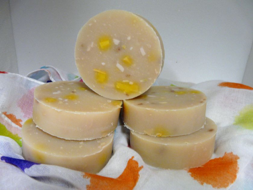 Blending the sweet, juicy scent of pineapple with creamy coconut and warm vanilla.  Each individual soap is unique, showing the natural variations in colour and shape that come with handmade soap.